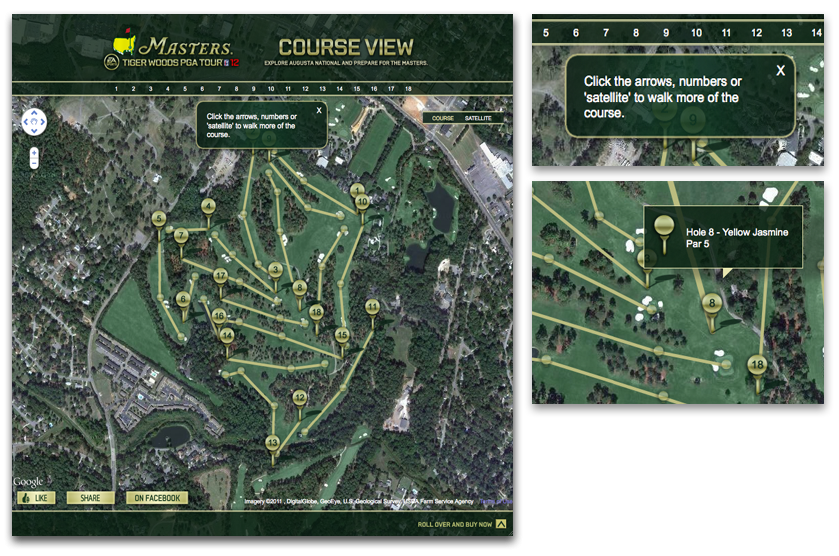 Course View lives right on the Tiger Woods PGA Tour Facebook Page. Sharing the entire experience is as simple as "liking," clicking one of the share buttons or copying and pasting a few lines of code. Course View helped the Tiger Woods PGA Tour Facebook Page traffic skyrocket by more than 41,000 “likes” in the first month alone.